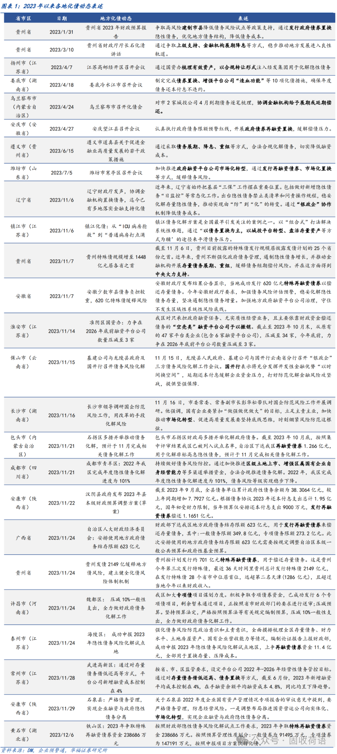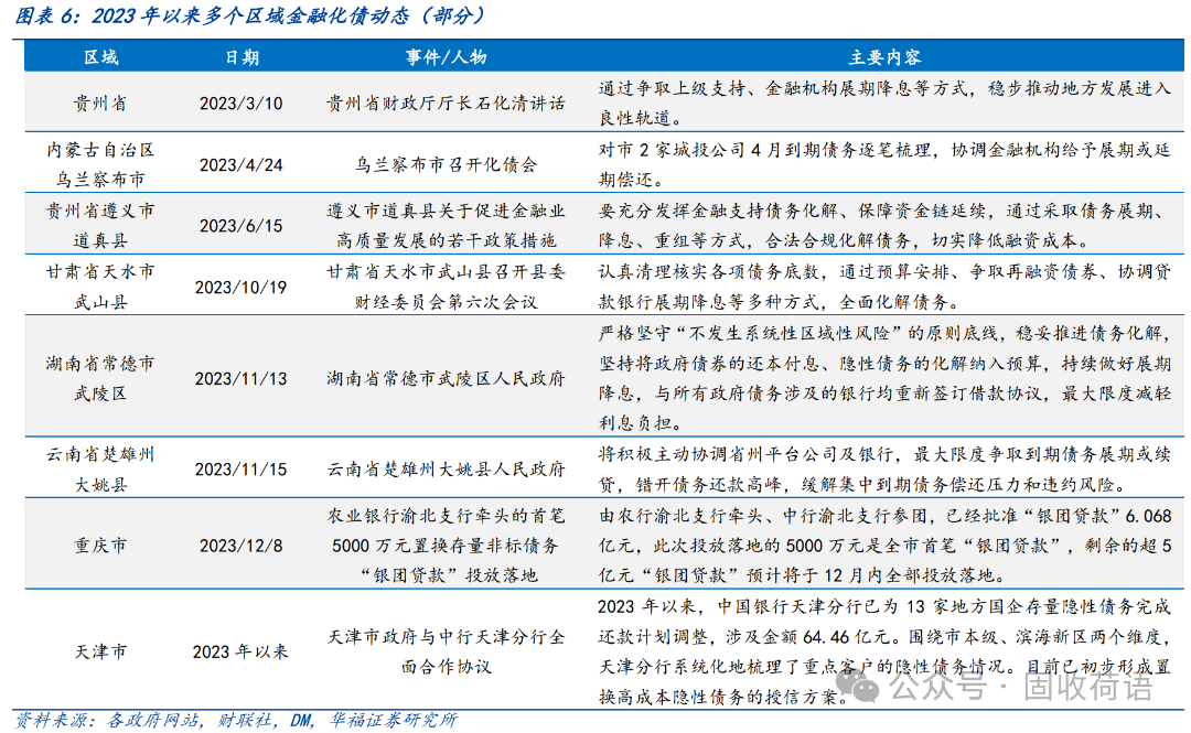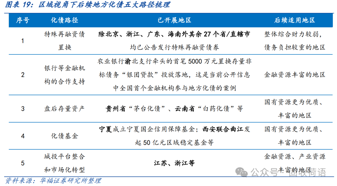 財(cái)政部《地方全口徑債務(wù)清查統(tǒng)計(jì)填報(bào)說明》中提出六種常見的債務(wù)化解舉措,具體為(1)安排財(cái)政資金償還;(2)出讓政府股權(quán)以及經(jīng)營性國有資產(chǎn)權(quán)益償還;(3)利用項(xiàng)目結(jié)轉(zhuǎn)資金、經(jīng)營收入償還;(4)合規(guī)轉(zhuǎn)化為企業(yè)經(jīng)營性債務(wù);(5)通過借新還舊、展期等方式償還;(6)采取破產(chǎn)重整或清算方式化解。同時(shí),根據(jù)各地化債動(dòng)態(tài)表述,各地根據(jù)自身情況,積極探索了金融機(jī)構(gòu)貸款置換、城投平臺(tái)整合或轉(zhuǎn)型、特殊再融資債置換、設(shè)立化債基金等方式推動(dòng)化債進(jìn)程。