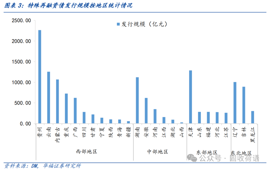 發(fā)行集中在西部地區(qū)。相較于東、中部地區(qū),西部地區(qū)整體綜合財(cái)力較弱,債務(wù)負(fù)擔(dān)較重,因此在上級(jí)支持方面存在較大優(yōu)勢。