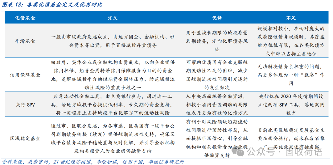 設(shè)立“化債基金”作為地方政府有效的管控城投債務(wù)風(fēng)險(xiǎn)的手段,被各地廣泛運(yùn)用,包括平滑基金、信用保障基金、央行SPV等?;鹳Y金主要來源于省內(nèi)/市內(nèi),調(diào)動(dòng)的是區(qū)域內(nèi)的金融資源,但規(guī)模相對(duì)有限;SPV在投放貸款的同時(shí)或要求抵押品,因此國有資源更為豐富的區(qū)域預(yù)計(jì)將獲得更大的支持。