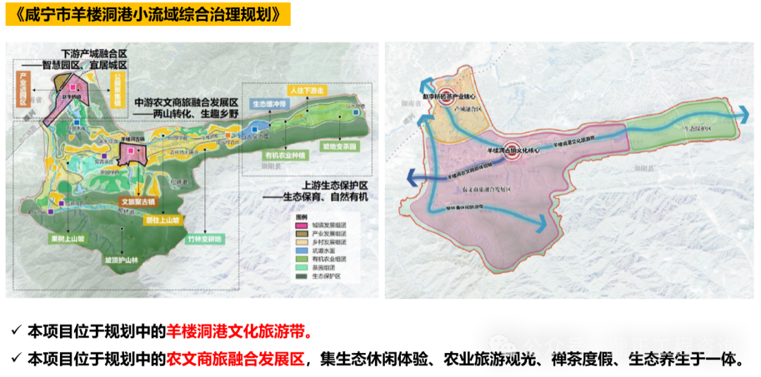 堅持下位規(guī)劃服從上位規(guī)劃、下級規(guī)劃服務(wù)上級規(guī)劃,形成流域治理“一盤棋”。落實上位規(guī)劃對本項目的定位、功能、治理重點等的相關(guān)要求,找準自身工作的側(cè)重點以及與全局工作的結(jié)合點,才能保證設(shè)計“不偏題”。以本項目為例,上位規(guī)劃將羊樓洞港小流域劃分為三個治理區(qū),本項目位于農(nóng)文商旅融合發(fā)展區(qū)和羊樓洞港文化旅游帶,因此本項目不僅要關(guān)注到水生態(tài)、水環(huán)境的修復(fù)提升,還要考慮流域生態(tài)價值的轉(zhuǎn)化及對旅游產(chǎn)業(yè)的推動,利用好流域內(nèi)的茶產(chǎn)業(yè)特色以及茶馬古鎮(zhèn)的歷史文化特色,實現(xiàn)生態(tài)美與產(chǎn)業(yè)綠深度融合。