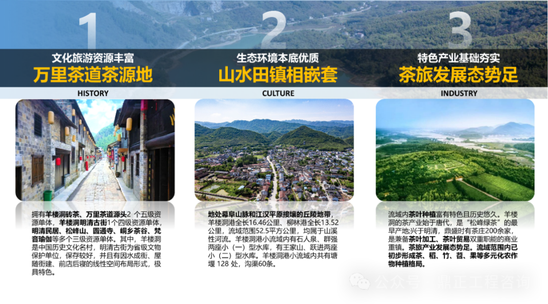以本項目為例,羊樓洞港小流域地處幕阜山脈和江漢平原接壤的丘陵地帶,流域內(nèi)有羊樓洞港、柳林港兩條水系,整體呈現(xiàn)山、水、田、鎮(zhèn)相嵌套的格局;流域內(nèi)擁有明清時期國際茶葉貿(mào)易名鎮(zhèn)——羊樓洞古鎮(zhèn),這里是歐亞萬里茶道的源頭;流域內(nèi)茶葉種植特色歷史悠久,茶旅產(chǎn)業(yè)發(fā)展態(tài)勢正足,并且已初步形成茶、稻、竹、芍、果等多元化農(nóng)作物種植格局。