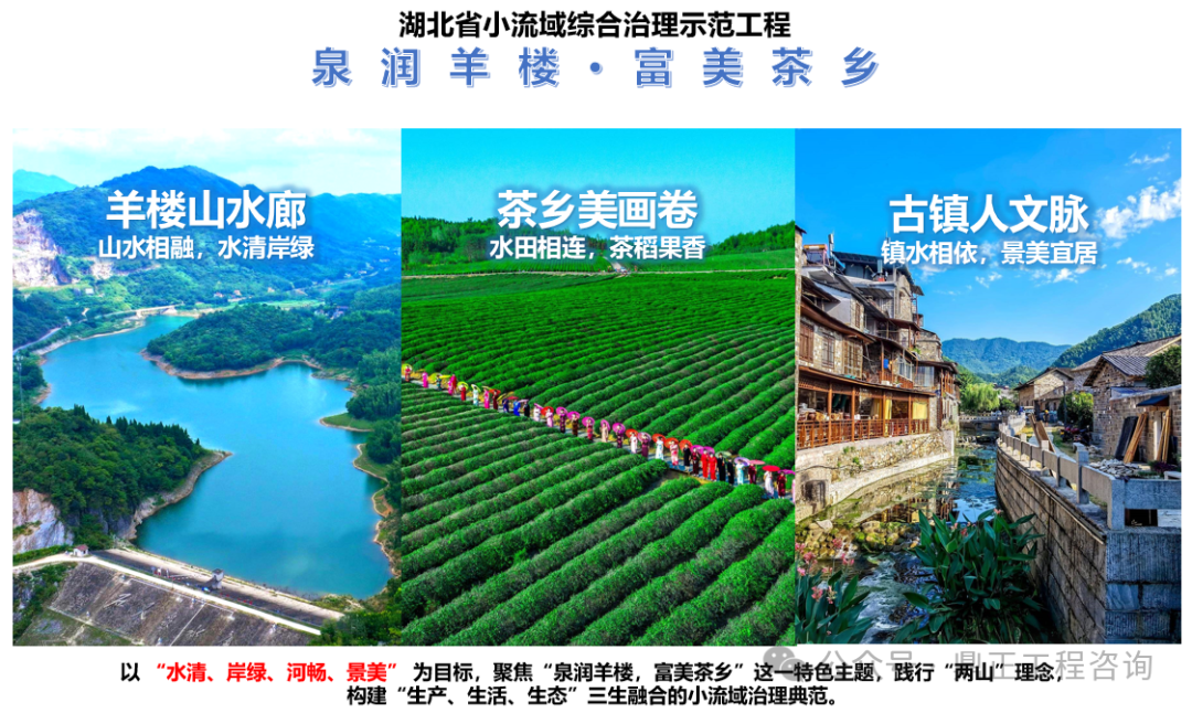 以本項目為例,設(shè)計提出以 “水清、岸綠、河暢、景美” 為目標,聚焦“泉潤羊樓,富美茶鄉(xiāng)”這一特色主題,踐行“兩山”理念,構(gòu)建“生產(chǎn)、生活、生態(tài)”三生融合的小流域治理典范。