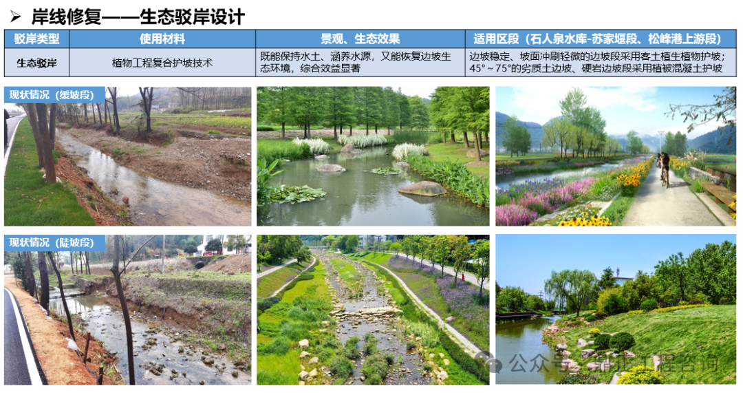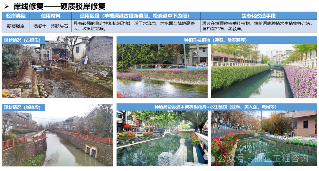 生態(tài)方面,打造“羊樓生態(tài)廊”,以水提質(zhì),修復(fù)流域生態(tài),即實施一批駁岸整治、水質(zhì)提升、生境構(gòu)建等河道治理措施進行水岸共治。針對水生態(tài)的修復(fù),根據(jù)不同水體類型提出技術(shù)方式;對于岸線的修復(fù),又針對不同的駁岸類型提出適用的整治措施。