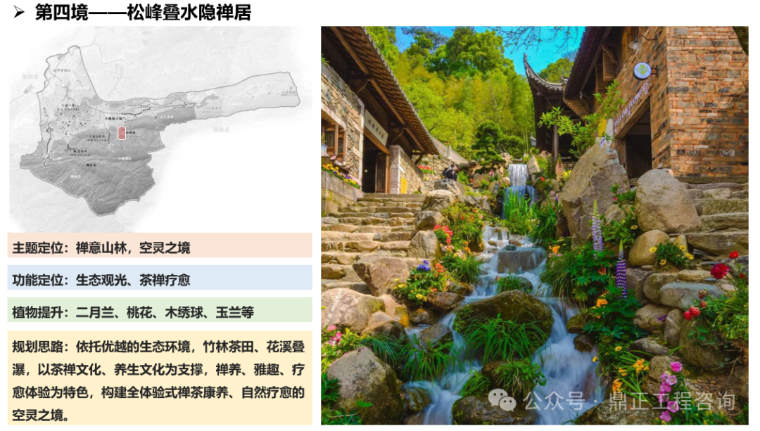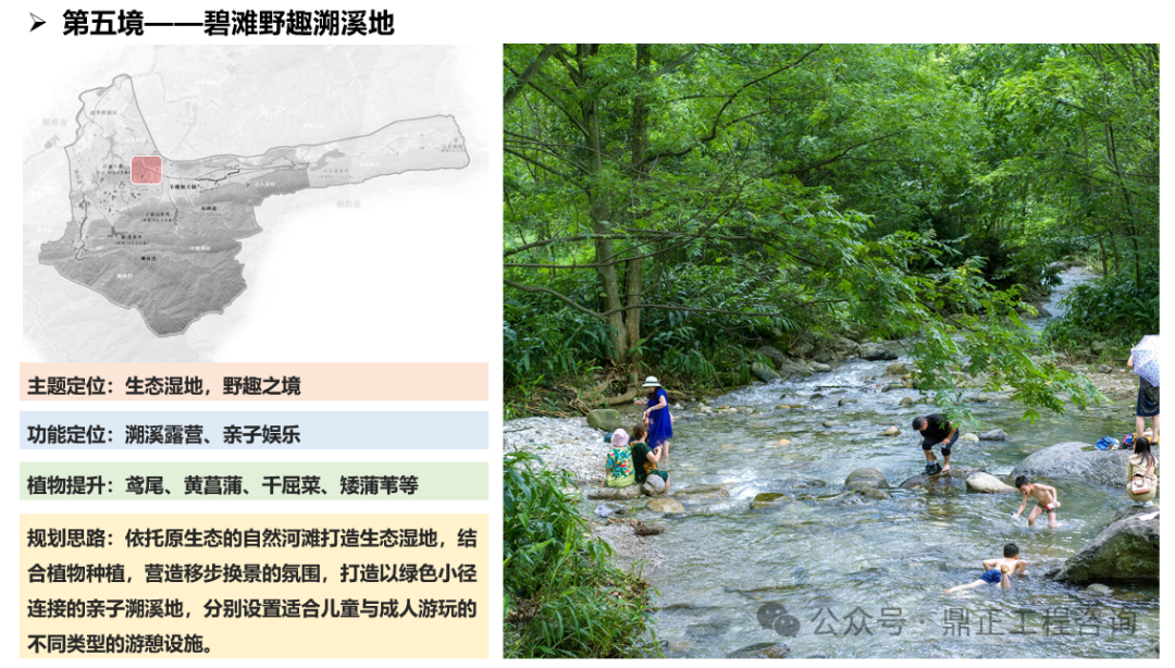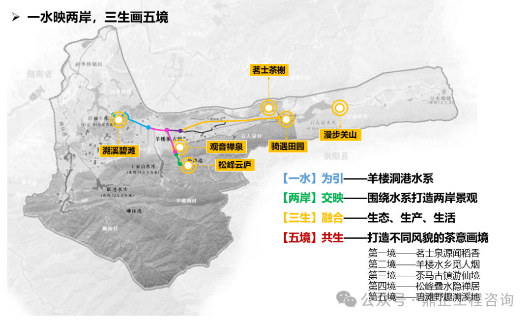 一水為引,指出治理對象,即羊樓洞港小流域;兩岸交映,指出治理范圍,即包括上下游、左右岸、堤內(nèi)外;三生融合,指出治理路徑,即走好生產(chǎn)、生活、生態(tài)協(xié)調(diào)發(fā)展之路;五境共生,即為五個治理分區(qū),通過分段體現(xiàn)差異化分區(qū)的理念,以線帶面也利于實施過程中分期分段逐步推進。每個分區(qū)都有具體的功能定位、治理目標、治理標準,因此不同分區(qū)名稱就是該區(qū)治理特色的高度凝練,既要體現(xiàn)水系的區(qū)位,如“茗士泉源”對應(yīng)相公泉,“茶馬古鎮(zhèn)”對應(yīng)羊樓洞古鎮(zhèn),“松峰”對應(yīng)松峰山;也要體現(xiàn)水系的形態(tài),如“泉”、“溪”、“疊水”等;還要體現(xiàn)水系的功能,如“稻香”對應(yīng)田園塘渠,“水鄉(xiāng)”對應(yīng)生活河道,“碧灘”對應(yīng)生態(tài)濕地等。