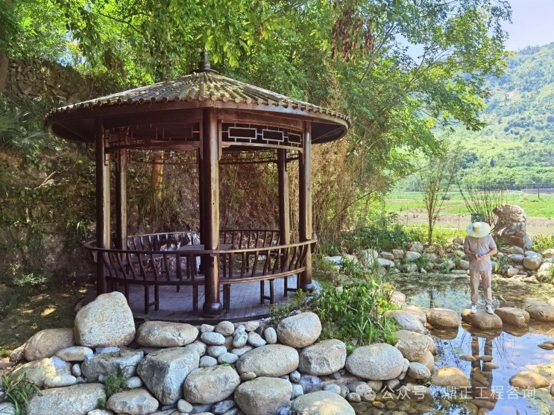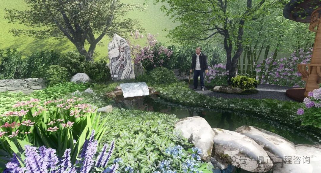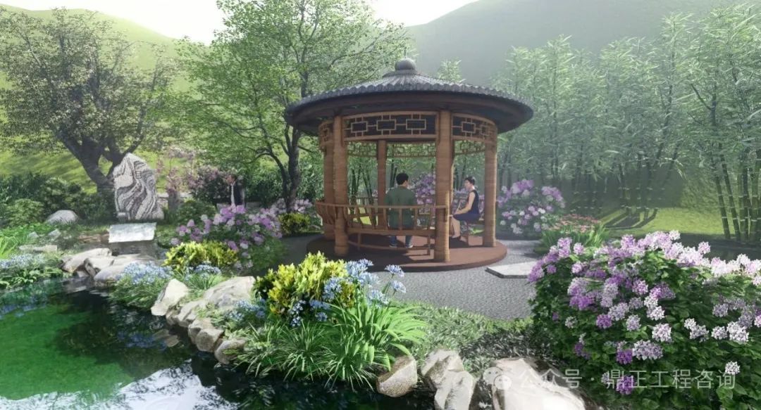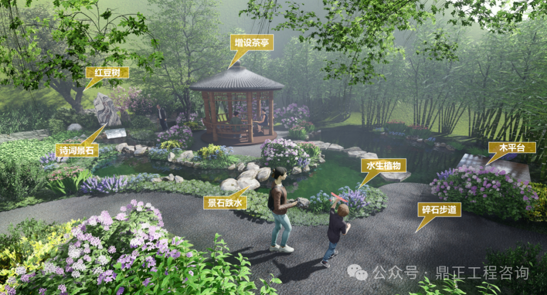 水景觀水文化打造:通過深挖相公泉歷史文化內(nèi)涵,進行本地印象提煉。“相公”一詞在古代,是妻子對丈夫的稱呼,也是君子、生員(秀才、相公)、宰相的另一種叫法。君子愛茶,沏茶品茗,修煉品性,以茶可雅志,茶是象征著塵世的純潔。設(shè)計從自然山水出發(fā),落位于閑情逸致設(shè)計基調(diào),泉眼處采用題字景石配上一棵姿態(tài)旖旎的紅豆,視線端頭一幅竹影錦鯉、花木跌水的畫面映入眼簾,兩側(cè)的樹木林立,開合有致,整個節(jié)點的中心是一座圓頂茶亭,在亭中,一壺清茶問道,仿佛拉近了古今往事,也增加了場地的記憶,呈現(xiàn)出 “千年古樹頻招手,萬年清泉溢清香”的意境。