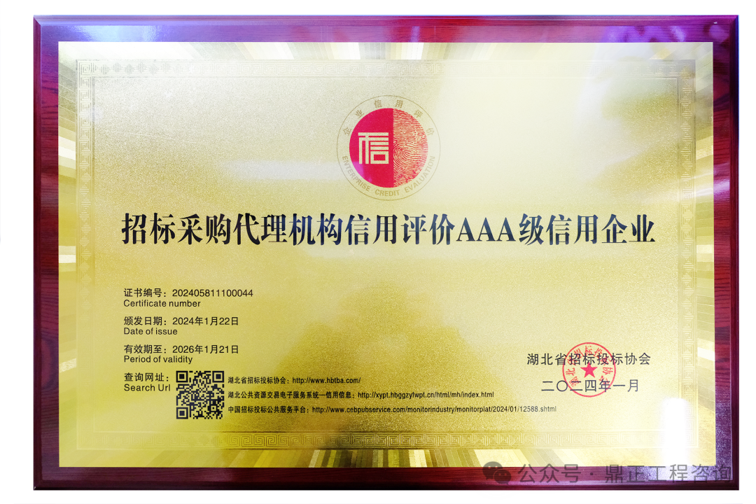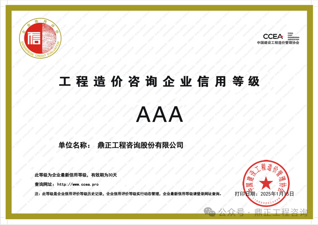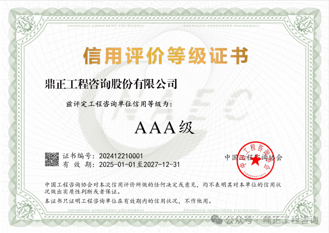 近日,中國工程咨詢協(xié)會發(fā)布了2024年度工程咨詢單位信用評價公告,鼎正憑借優(yōu)異的誠信建設和信用管理能力,榮獲“AAA級信用等級”評價。